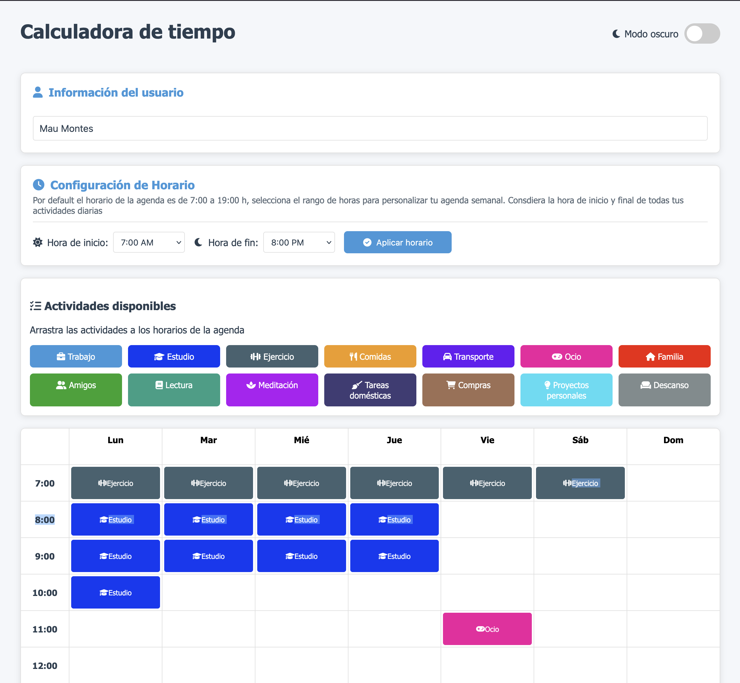 Me gusto la actividad ya que me fue llevando a la realidad de todas las actividades que realizo en la semana, pero más me gusto porque inicio mis días con la familia y creí que no pasaba mucho tiempo con y para ellos, observé que no he dedicado un tiempo especial solo y exclusivo para estudiar ya que lo hago en los momentos libres dispersos que tengo principalmente en mi trabajo porque en casa me distraigo mucho.