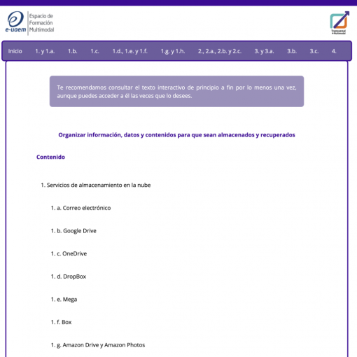 Publicada marzo 9, 2022 Organizar información, datos y contenidos para que sean almacenados y recuperados Puedes consultar el recurso en http://portal.e-uaem.mx/UATM/AID/1300/